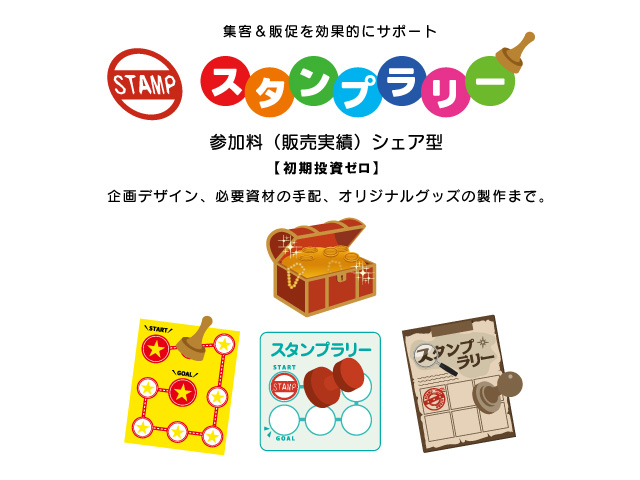 「スタンプラリー&ギフト」は、商業施設様・遊戯施設様等におけるスタンプラリー企画制作のワンストップ・ソリューション・サービスです。企画デザイン、必要資材の手配、貴社オリジナル参加記念品の製作までトータルサポート。参加料(売上実績)シェア方式ですので、貴社のお手間や初期投資なく実施可能です。